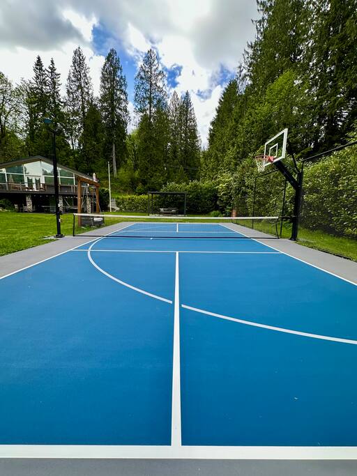 The most secluded and private lake front property around with an expansive lawn perfect for summertime fun, or offseason serenity. Inside, the open concept home welcomes you to unwind with awe inspiring views of the lake through large windows. Enjoy slowing down and getting cozy by the beautiful gas fireplace on chilly evenings, or enjoy the cool AC during the warmer season. Cook a meal in the updated kitchen and gather around the large dining table with family and friends. The feeling of connection and relaxation continues downstairs, in the warm den - perfect for movie nights, popcorn & puzzles. Two of the bedrooms have king beds, a 3rd bedroom has a queen bed, and downstairs den has a single pull out couch. The house has two bathrooms, and plenty of options for comfortable seating. Outside, you can have fun playing pickleball on the full sport court, half-court basketball, or enjoy the outdoor ping pong table on the patio! In the warmer months, you will find the large private lawn perfect for playing volleyball or badminton with friends or for throwing the ball for your pups. You can also enjoy a peaceful paddle in the canoe, stand up paddleboarding, or a low-stakes adventure in the foot pedal boat, all provided for your use. The property is spacious and pleasantly private. The neighboring properties on both sides are undeveloped and wooded. There is also a small slow moving creek which runs through the property near the lakeside boat house