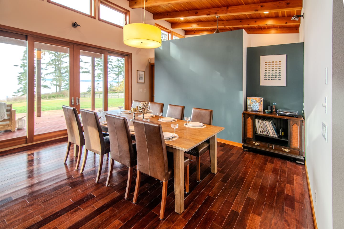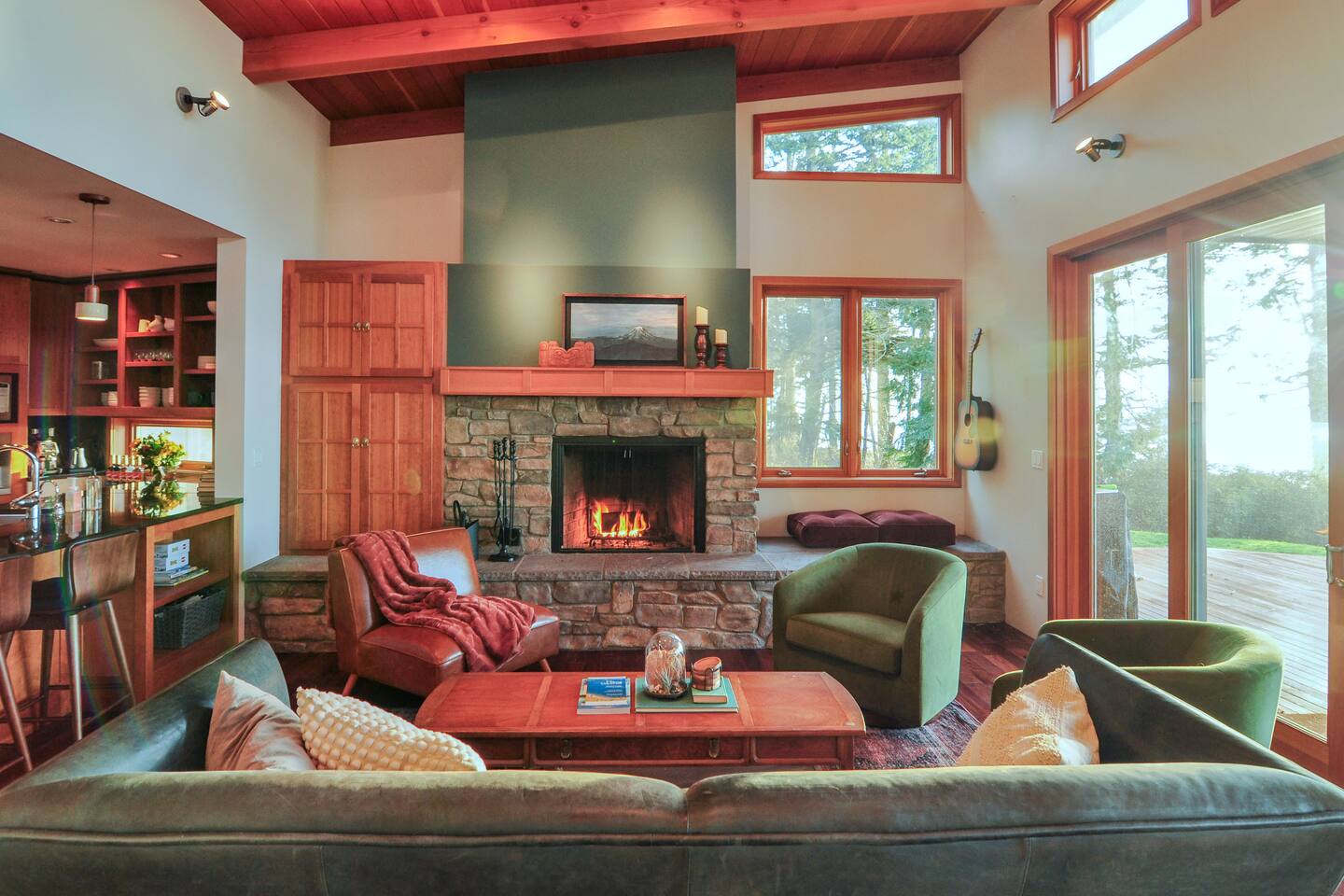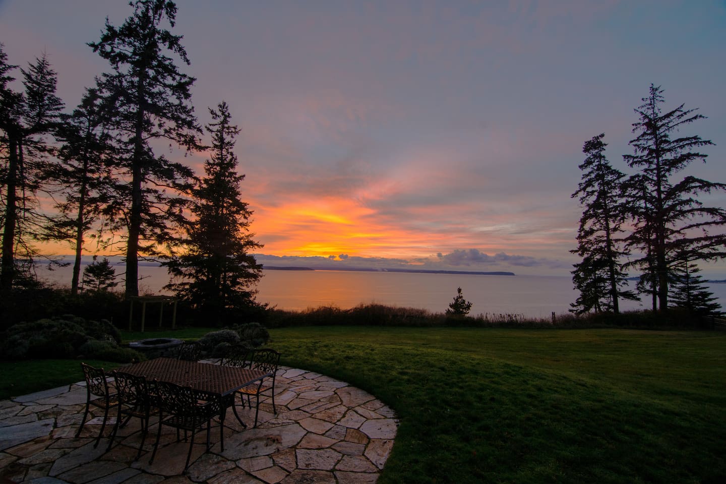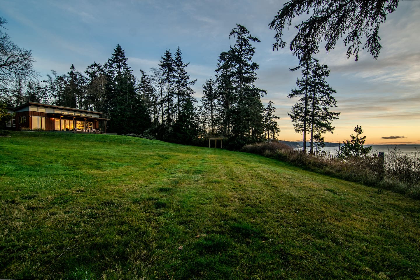 The Madrona West is the best of the northwest. Inside you are greeted with breath taking views of Admiralty Bay from the spacious living room with high ceilings and large windows. Enjoy the wood-burning fireplace and a dining space for 10 as well as 3 counter stool seats. Eclectic mid-century modern combined with vintage touches warm up this cozy space for you to relax, connect and enjoy the quiet moments. Restful spaces include 4 large bedrooms 3 of which have a king bed and the 4th has a queen bed. All bedrooms have amazing water views. The kitchen is well stocked with everything needed to make and serve meals for your friends & family or to prepare for a quiet meal for two. Nearby, the den has an 65" tv and cozy couches for movie nights. The spacious covered deck overlooks a lawn and expansive views of the water with jaw dropping views of the sunset over the mountains. Enjoy the outdoor dining table or the covered deck with oversized chairs. Go out back for a game of basketball or pickleball on the sport court or challenge your family to a game of ping pong on the outdoor table! We are dedicated to providing a truly high quality guest experience and have obsessed over the details. From the moment you arrive, you'll find everything seamlessly in place, allowing you to effortlessly relax and enjoy meaningful connections with your friends and family. The lawn is not watered to conserve water and to promote bank ground stability. Because of this, the lawn does dry up and yellow around mid July depending on rainfall and greens back up late September. The house does not have ac, but temperatures are generally cooler on the island and all bedrooms have overhead fans.