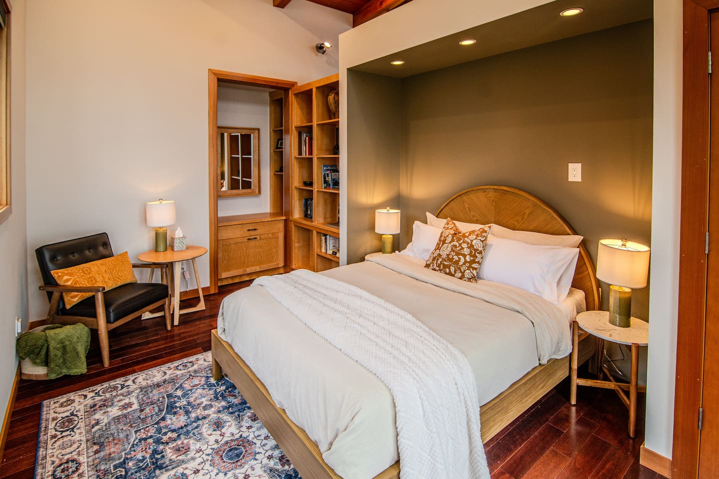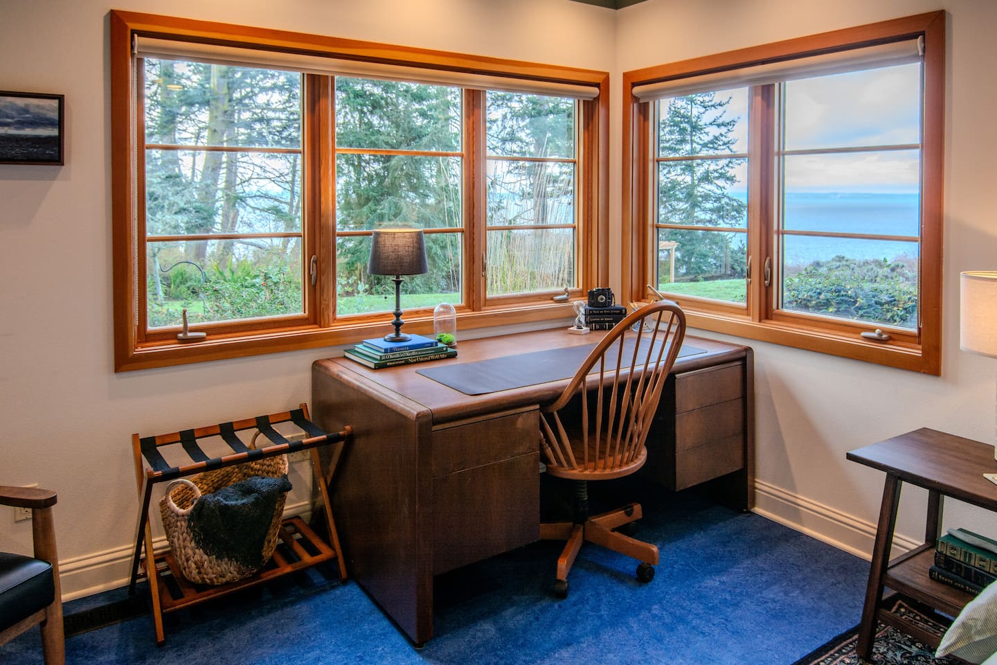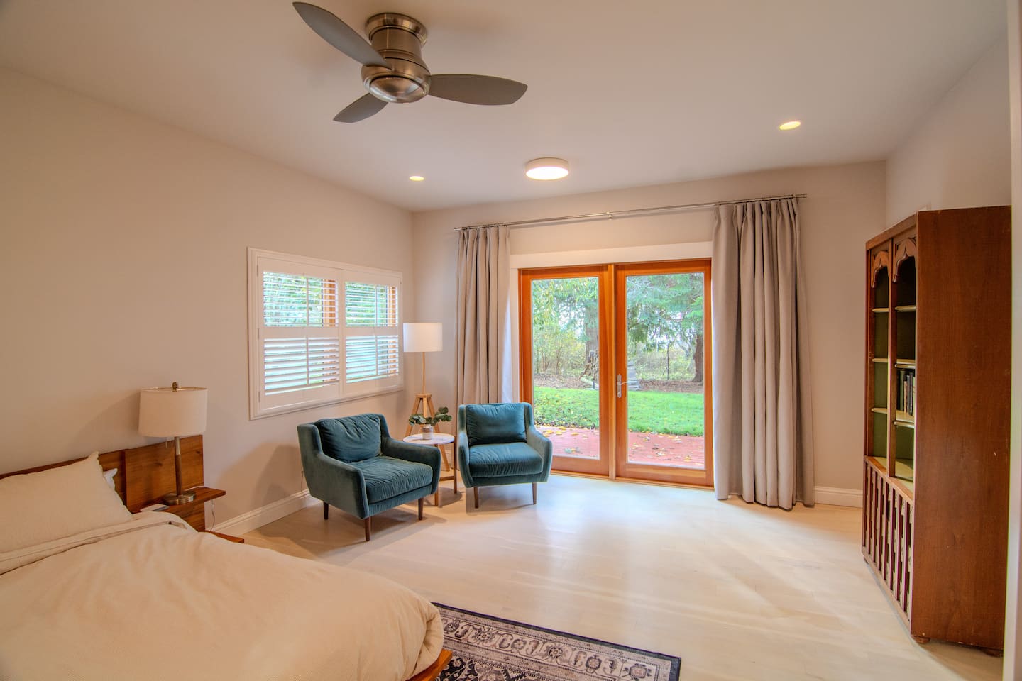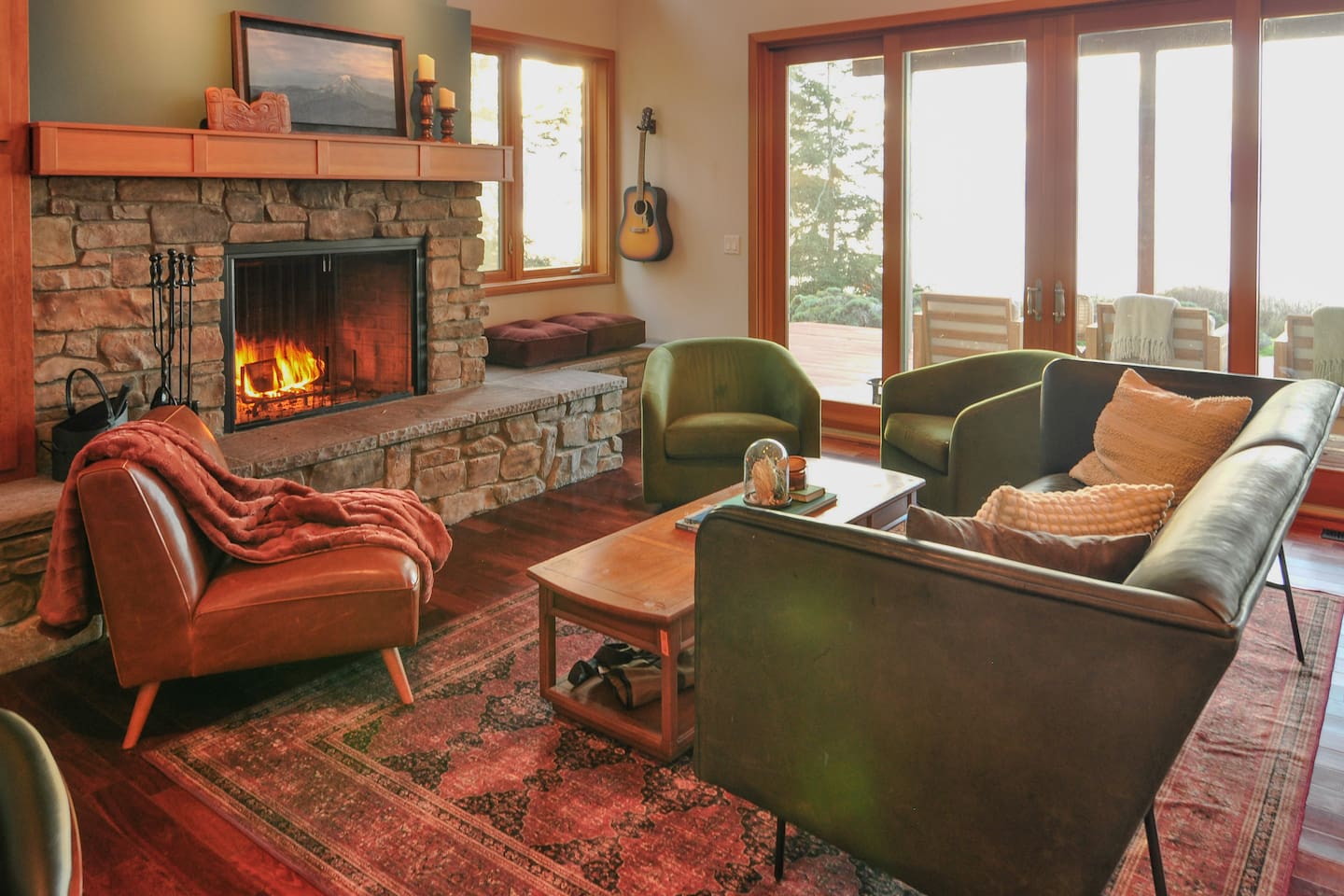 The Madrona West is the best of the northwest. Inside you are greeted with breath taking views of Admiralty Bay from the spacious living room with high ceilings and large windows. Enjoy the wood-burning fireplace and a dining space for 10 as well as 3 counter stool seats. Eclectic mid-century modern combined with vintage touches warm up this cozy space for you to relax, connect and enjoy the quiet moments. Restful spaces include 4 large bedrooms 3 of which have a king bed and the 4th has a queen bed. All bedrooms have amazing water views. The kitchen is well stocked with everything needed to make and serve meals for your friends & family or to prepare for a quiet meal for two. Nearby, the den has an 65" tv and cozy couches for movie nights. The spacious covered deck overlooks a lawn and expansive views of the water with jaw dropping views of the sunset over the mountains. Enjoy the outdoor dining table or the covered deck with oversized chairs. Go out back for a game of basketball or pickleball on the sport court or challenge your family to a game of ping pong on the outdoor table! We are dedicated to providing a truly high quality guest experience and have obsessed over the details. From the moment you arrive, you'll find everything seamlessly in place, allowing you to effortlessly relax and enjoy meaningful connections with your friends and family. The lawn is not watered to conserve water and to promote bank ground stability. Because of this, the lawn does dry up and yellow around mid July depending on rainfall and greens back up late September. The house does not have ac, but temperatures are generally cooler on the island and all bedrooms have overhead fans.
