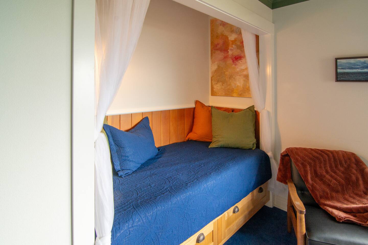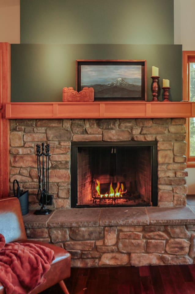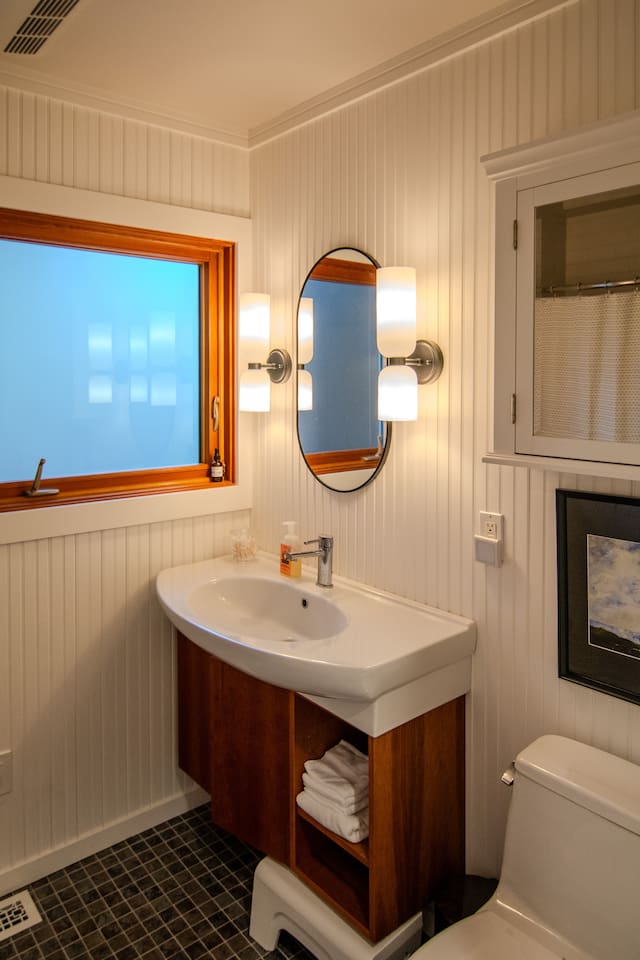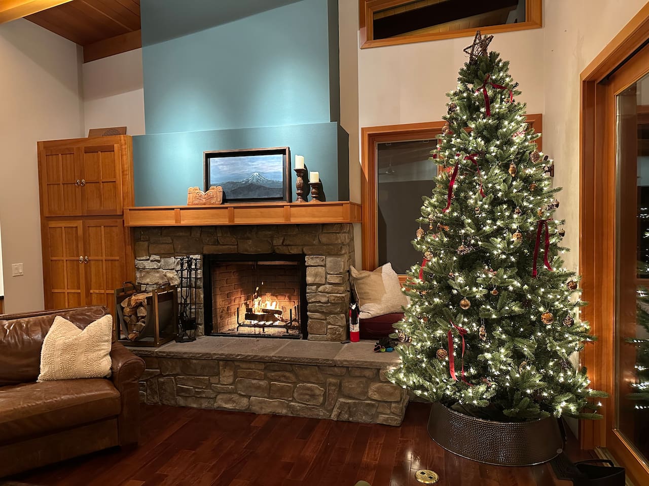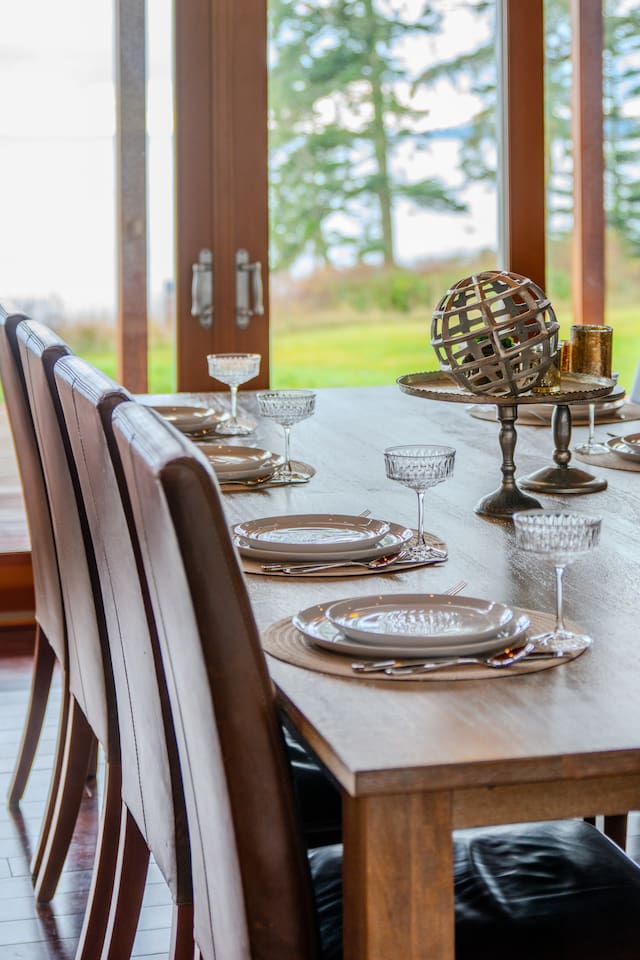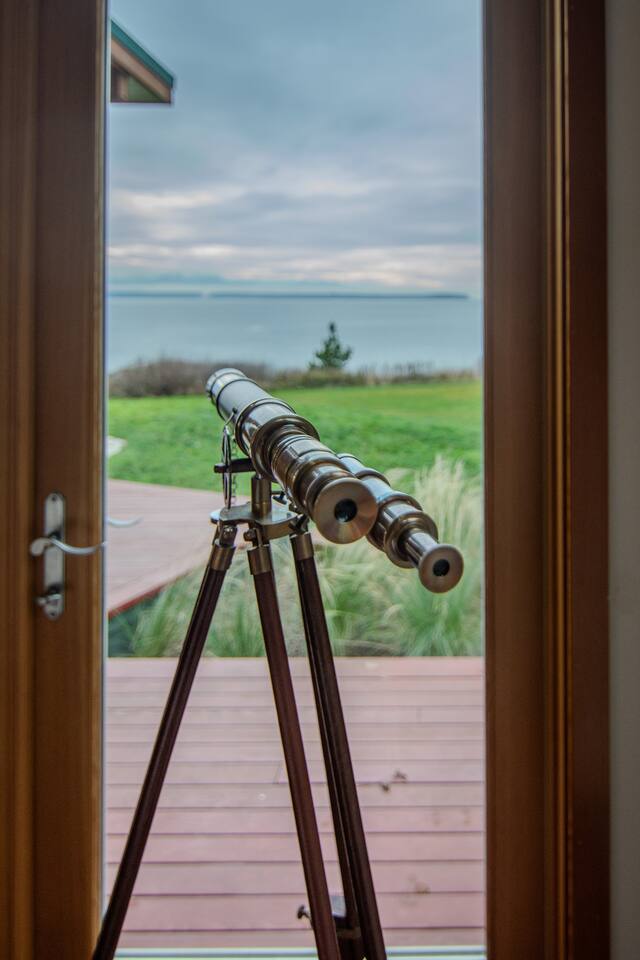 The Madrona West is the best of the northwest. Inside you are greeted with breath taking views of Admiralty Bay from the spacious living room with high ceilings and large windows. Enjoy the wood-burning fireplace and a dining space for 10 as well as 3 counter stool seats. Eclectic mid-century modern combined with vintage touches warm up this cozy space for you to relax, connect and enjoy the quiet moments. Restful spaces include 4 large bedrooms 3 of which have a king bed and the 4th has a queen bed. All bedrooms have amazing water views. The kitchen is well stocked with everything needed to make and serve meals for your friends & family or to prepare for a quiet meal for two. Nearby, the den has an 65" tv and cozy couches for movie nights. The spacious covered deck overlooks a lawn and expansive views of the water with jaw dropping views of the sunset over the mountains. Enjoy the outdoor dining table or the covered deck with oversized chairs. Go out back for a game of basketball or pickleball on the sport court or challenge your family to a game of ping pong on the outdoor table! We are dedicated to providing a truly high quality guest experience and have obsessed over the details. From the moment you arrive, you'll find everything seamlessly in place, allowing you to effortlessly relax and enjoy meaningful connections with your friends and family. The lawn is not watered to conserve water and to promote bank ground stability. Because of this, the lawn does dry up and yellow around mid July depending on rainfall and greens back up late September. The house does not have ac, but temperatures are generally cooler on the island and all bedrooms have overhead fans.