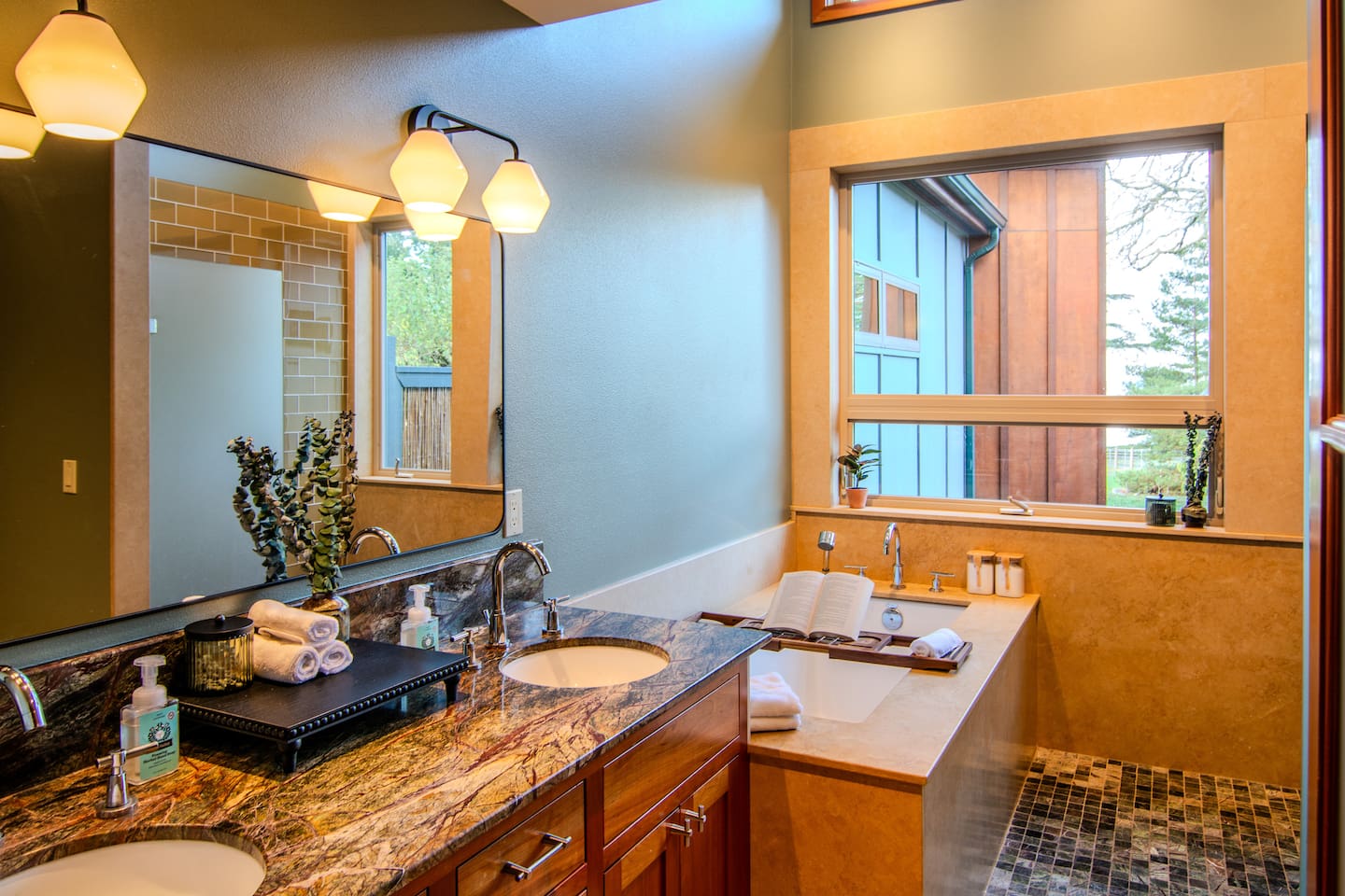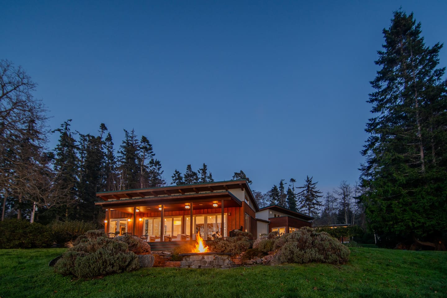 The Madrona West by Stay Madrona. Relaxed luxury meets the Pacific Northwest in this modern and warm waterfront retreat with sweeping sunset views over the Olympic mountains. Enjoy sunsets on the covered deck, wildlife watching, a shared sport court with basketball, pickleball, and ping pong, beach access via a 15 minute stroll through a quiet neighborhood, or hot tub soaking under the stars[